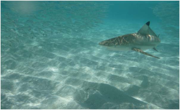 One morning I came across several small black tips (1m long) that had pushed a shoal of baitfish up against the beach. I just waded into the water to take this pic.