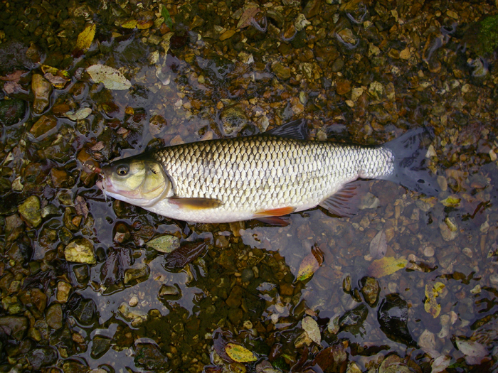 Playing a river thinlip hooked on a homemade, rag baited spinner.