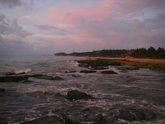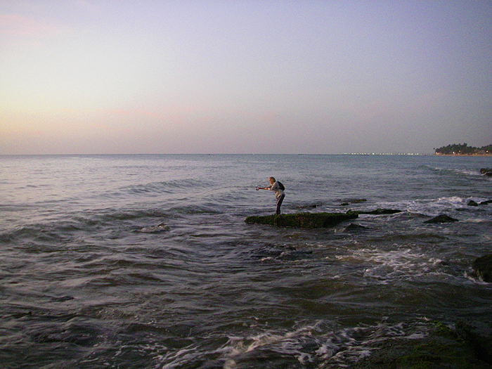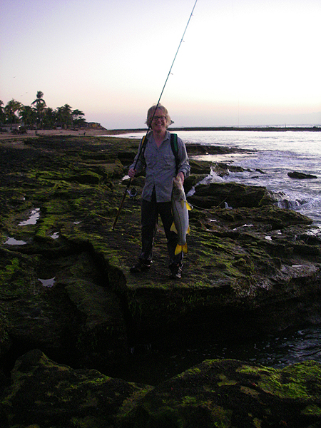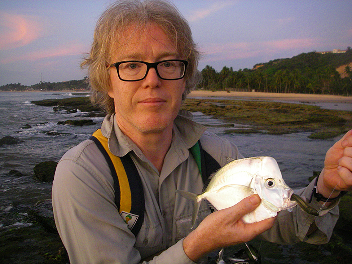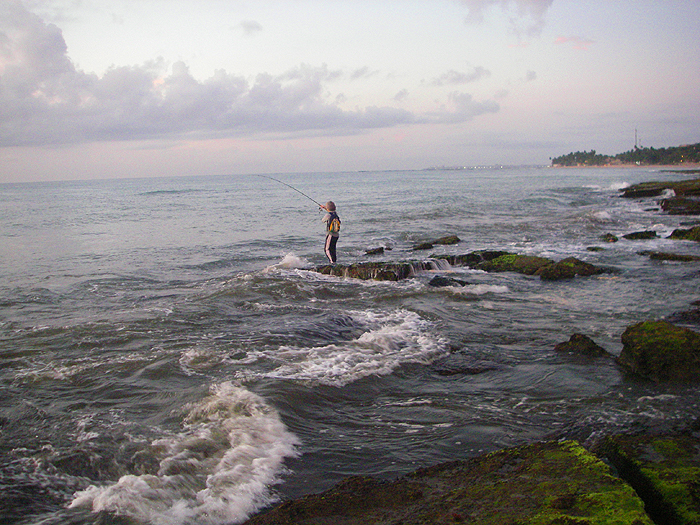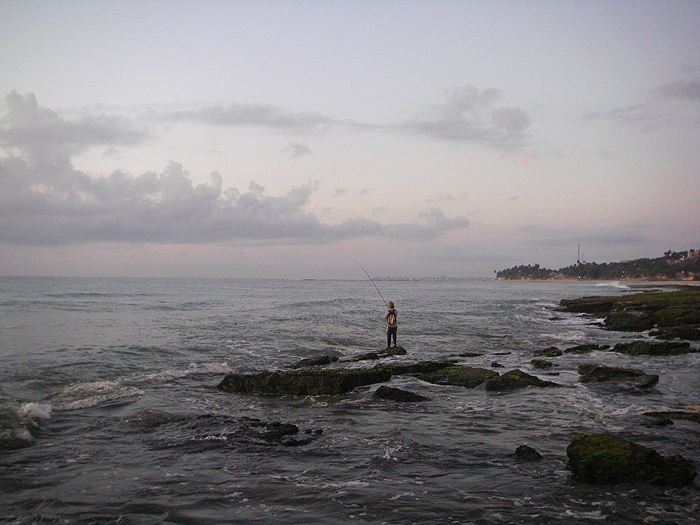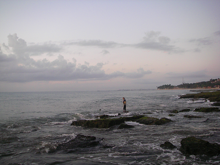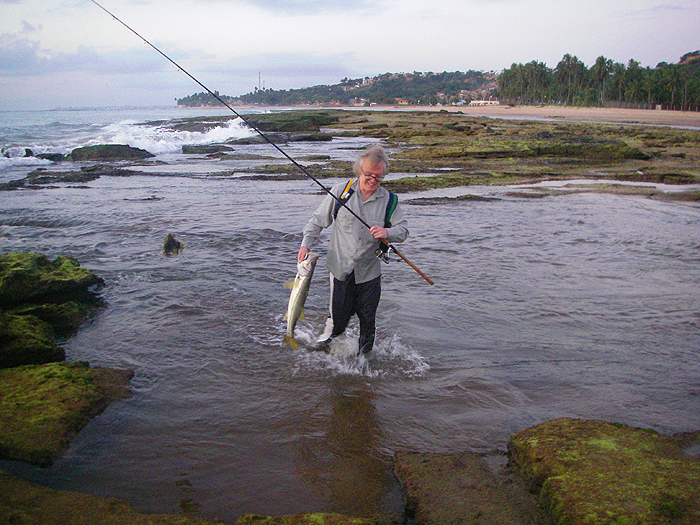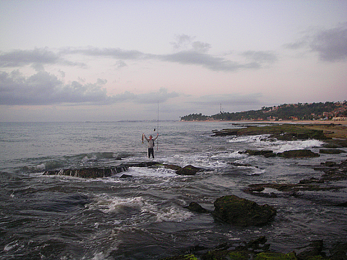 Richard has been living in Brazil for over six years now and of course with the demands of learning Portuguese, working and raisng a young family, learning about the local fishing has been a slow process. In fact he is pretty experienced at using bait to catch snapper and several species of catfish but consistency with the larger fish such as jacks and snook has so far eluded him. On the bright side just before our recent visit (we arrived on the second of January) he'd tried to suss out the possibility of catching snook from the shore and on the previous set of tides had been broken by a very large fish which took a lot of line before ploughing into the rocks. Anyway, we were encouraged when, on the first morning of my stay, we parked the car, picked up the rods, paddled out before dawn onto the rocky reef at Mermaid Beach and began to cast into the pounding surf.