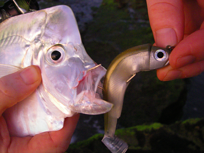 The Black Minnow wasn't our only successful lure. The biggest fish took a very large, unweighted, white Slug-Go.