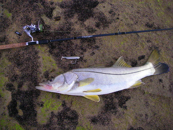 The following morning we were there again on the same rocks with the same gear - keen as ever. This time we had nothing for perhaps fifteen minutes then suddenly Richard, standing just to my right called that he was in and I looked up to see the rod well bent with line streaming off against a tight clutch. The fish set off to his right, the direction in which he'd lost his big fish before I arrived. Not surprisingly we were concerned and Rich danced down the rocks and waded out to get a better angle for playing his snook. It was probably five or ten minutes before he managed to slide his catch onto a smooth, flat rock and to pick it up for a photograph. Sixteen pounds of prime snook - what a start!. We still had half-an-hour before it was time to pack in so Rich clipped on another minnow (the first one was shattered by its experience) and I continued fishing. My big Slug-Go was sliding just under the surface. It looked fantastic and I was confident that it would attract a fish if I could find one. In fact probably just five minutes elapsed before there was a mighty boil, just beyond the rocks, as it neared the end of a retrieve and the rod was almost snatched from my hand. I was in!/P>