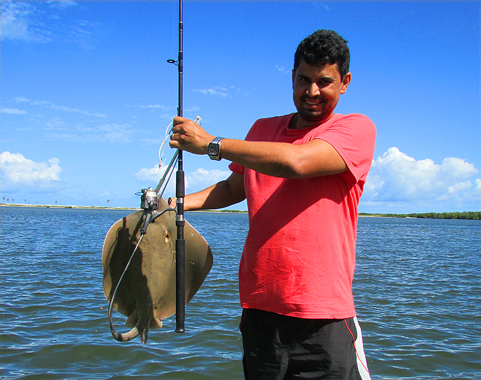 The action was pretty non-stop for the 2 hours we fished. After only 5 minutes I had a good run which dropped the bait before I could tighten the clutch. This was quickly followed by another fish that did the same thing. I looked up to see Paulo into a good fish – after 10 minutes of hard work against the current a nice stingray (about 15lb) swung into view. After carefully unhooking it, being careful to avoid the poisonous spine, I took a few trophy shots and Paulo slid it back into the water. I then had a funny stop-start bite that turned into a little snapper of about 2lb which had, unfortunately, swallowed the circle hook. This was followed by another fish dropping the bait after a good run – could they be feeling the pressure of the clutch, even though it was really lightly set? (I reckon so - I had exactly the same comment from a bass angler last week. M.L.) I changed tactics: I grabbed a beach chair and sat with the bale-arms open and the line in the fingers of either hand. I actually prefer fishing like this – there is something really special about feeling the line rushing through your fingers.