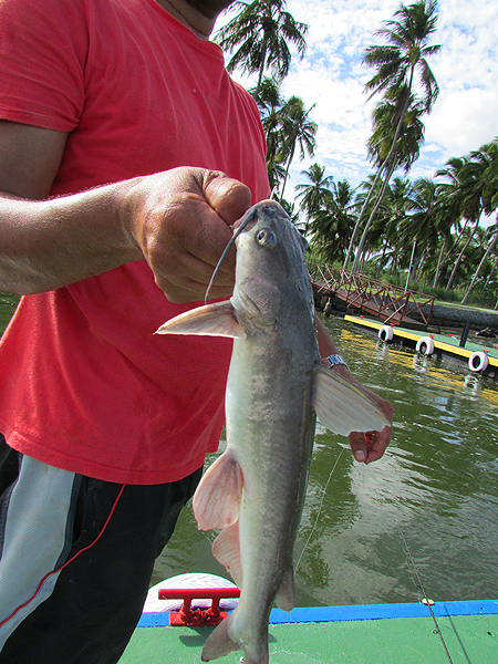 I immediately had a bite that I let take 10m of line before flipping the bale-arm and gently tightening – after a brief fight I slid a nice sea catfish of about 3lb onto the pier. Next I had a strange, slow bite which took the line in ‘jerks’. I tightened into a substantially bigger fish that turned out to be a disgusting green moray eel of about 10 lbs, much to everyone’s amusement. Luckily, it managed to saw through the 40lb nylon trace just as we were trying to gaff it, saving us the slimy task of unhooking it. The next bite was really interesting – something big grabbed the bait and sprinted off into the main channel. Unfortunately, it dropped the captainfish when I tightened and, when I wound in, the bait had been squeezed in the middle rather than hacked in half. This suggests it was probably a crevalle since most of the other common fish in this spot (catfish, rays, morays, puffers) rip the baits. I then landed another catfish almost identical to the first. The bites kept coming, but we stopped hooking them and started winding in dismembered live baits. This is a sure sign of big pufferfish, a suspicion that was confirmed when Paulo played one into the edge before it sliced through his line.