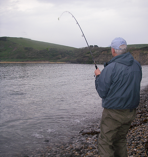I was down on the beach at the crack of dawn and to my surprise I found another car already in on the cliff top car park. I picked up the gear and walked along to my chosen spot - conditions looked good so I carefully placed my mackerel bait on its 6/0 circle hook on the sea bed and sat on a boulder waiting for the tide to come in. It was easy fishing as there was no wind at all but by the time the water had risen so that there was half-a-metre over my bait I was deciding that it wasn't going to be my morning. I made the (always difficult) decision to pack in and as I reeled in I saw someone coming back along the shore. As the figure approached it turned out to be Kevin, a chap who visits the area to fish and who I see most years when I'm fishing the Purbeck coast. My friend stopped for a natter and it turned out that he'd also tried a bait but had spent most of his time spinning - like me, all to no avail. We talked as we walked back along the shore. It was still fairly early so when we arrived at a short stretch of shingle I mentioned that I'd caught decent bass there in previous years and suggested that we might give it ten or fifteen minutes before we left.