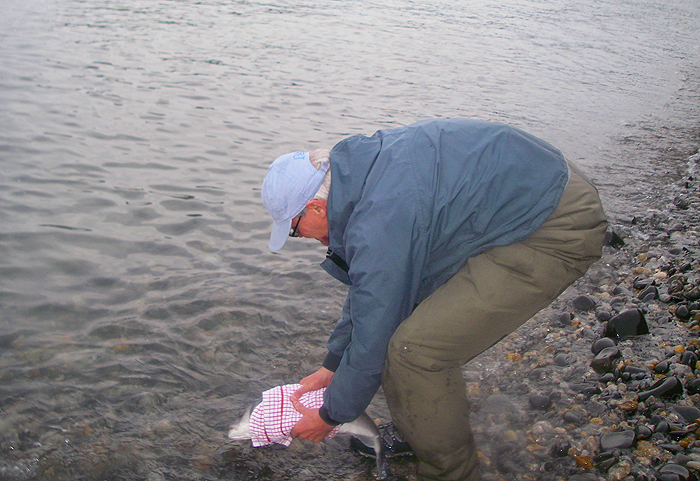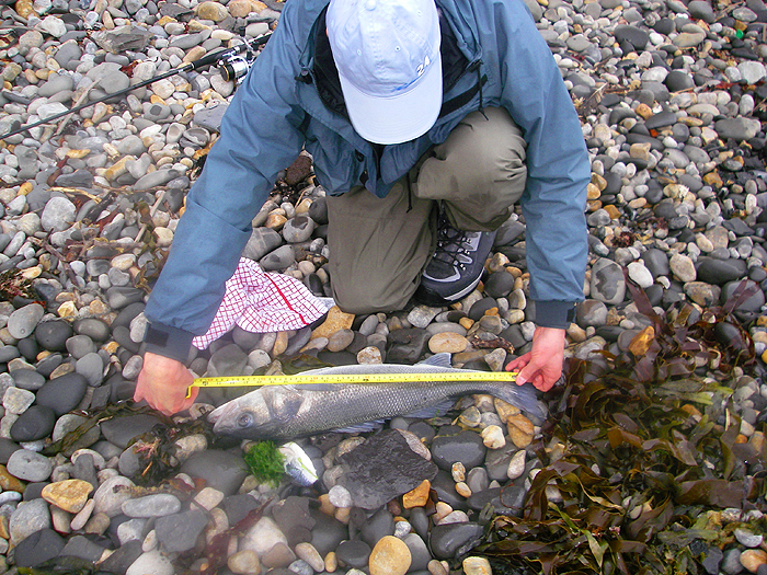Now the line was running out quickly and Kevin was on his feet and preparing to strike. He dropped the rod tip to give a bit of slack as he gently closed the bale arm then he struck firmly and the rod whacked over as the fish took off. I grabbed my little camera from the bag and began to take a few pictures. The bass fought hard taking line in short rushes and it was a little while before it tired enough for him to draw it onto the gravel. It was a beauty. I picked up my pliers and removed the hook which was further back in the mouth than we would have wanted. Kevin commented that he'd use a circle hook next time he tried. I took a couple of pictures as he measured his fish and carefully returned it to the sea. The took some time to recover but eventually it wagged its tail and swam away strongly. Fantastic!