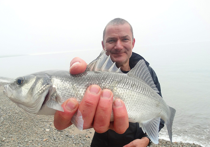 This session started wet, in fact it rained for the first two hours and was hot, humid & foggy. The sea was as calm as it can get. This time there were loads of fish visible throughout the day, mainly mullet but I'm sure I could see bass feeding in the shallow calm water early on. Once again we had six bass (all tiddlers as Bill says). Two of them were less than 0.5lb and the best this time was about a couple of pounds. On this trip four of the fish took a Feed Shallow plug, we had one on a Sasuke 140 and the last one took an Evo Stix Redgill.