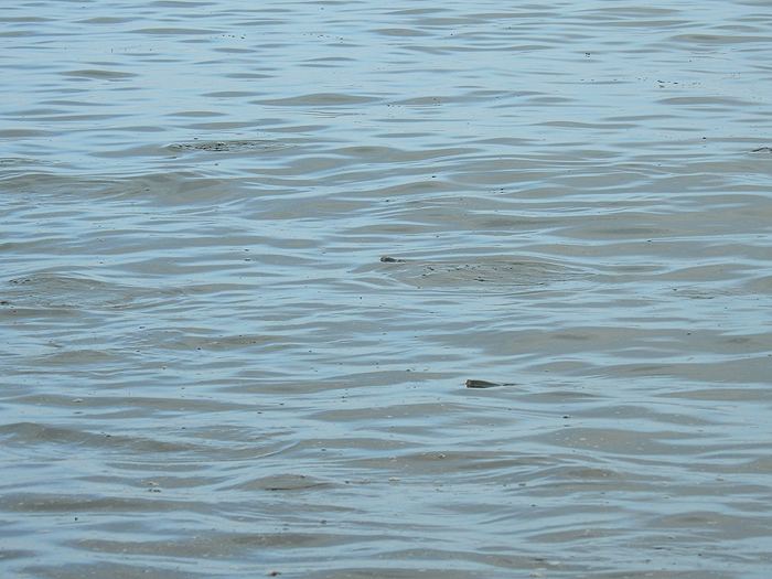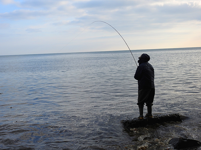 Sure enough when I got there (a further 100 yards or so) I found a few mullet feeding close in so I picked up the fly rod, baited my fly with a few maggots and began to cast to them. It quickly became apparent that this was not going to be easy. There was no problem putting a fly into the mullet shoals but as soon as it landed the line, cast and fly became plastered with slivers of slimy green, white and brown weed. Nightmare! Of course with the fish showing and egging me on I couldn't resist flogging away for a while but it was frustrating to say the least. I had only a single tiny pluck in the space of perhaps half-an-hour. By now it was about high water and looking back along the shore I could see Bill assiduously spinning. Every so often he fiddled about in his bag and I presumed that he was having the same weed problems that I was and changing lures to try and overcome them.