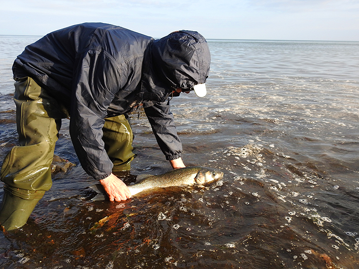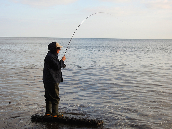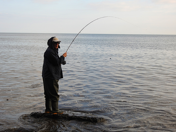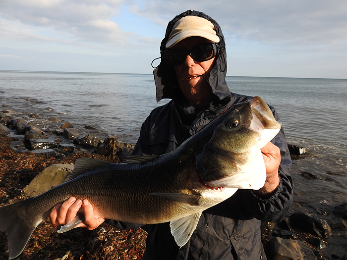 I was stunned but I hung on with the rod well bent to see what would happen. The line looked like a string of signal flags, it was draped with weedy pennants but the fly reel was turning and the fish was making its way out to sea. I shouted loudly (I can do that) for Bill to let him know that I was 'in' and he waved a hand to show that he'd heard me but he didn't come. I wasn't too bothered as it looked as though I was in for the long haul with my fish. Once or twice it lifted its big spiny dorsal fin just to show me who was boss but I knew that I simply had to be patient. After a few minutes I shouted for Bill again and looked round to see that he was just returning a silvery fish to the water. This time he went back to his bag, grabbed the camera and began to trot and stumble towards me along the shore. My fish was not in the mood to give in. Between periods of wallowing close in it set off out to sea, stripping the entire fly line down to the backing with a run towards the horizon. Each time I managed to ease it back towards me. On its third outward run it almost reached a big patch of wrack which was now sticking above the water but thankfully it stopped just short and I managed once again to bring it back in. This was the final long swim and it was then a matter of keeping the line taut as the fish cruised back and forth along the shore. Bill was snapping away with the camera and I was muttering curses about ******* fish and aching shoulders. Now I was thankful that I had someone to give me a hand. I applied as much pressure as I dared and drew the bass into shallow water. Bill plunged in and grabbed it. He dropped it, went white as a sheet, picked it up again and heaved it onto the weedmidden. We had it!