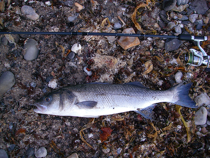 The next morning I decide to try again. This time the bait is a bit smaller - the front two thirds of a sardine, still fairly bulky but surely the hook is big enough for this one. This time I start fishing at 05:00 hr as I'd had no bites before that on the previous trip. This time it's flat calm, there's still a tinge of colour but virtually no wind - easy fishing. The bait lies unmolested until about 05:30 then away we go. It's taken quite a lot of line then suddenly it's dropped the bait. Surely it's not going to happen again? Almost at once I have another bite but this one takes a bit of line and doesn't develop any further, what a downer. It's almost six o'clock and I see the bow in the line begin to straighten. Let it go! It accelerates taking line against minimal resistance. I'm nervous but I have to tighten again. I close the bale, fearing the worst but no it's on and it stays on. The clutch is buzzing and the bass is pulling hard. It slows down and I begin to slowly pump it back. It runs again. 'Don't come off! Don't come off!' I'm muttering to myself and this time I really mean it. It didn't. I beach the fish and remove the hook from the scissors, measure it to the fork of the big tail - 67cm. A thinnish fish which didn’t really put up much of a fight. Never mind. Success at last.