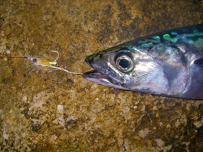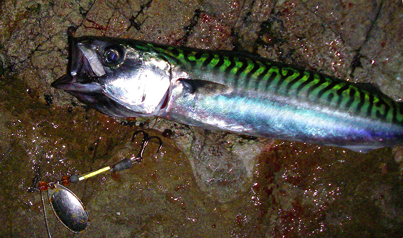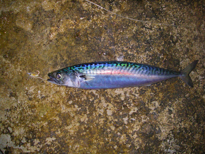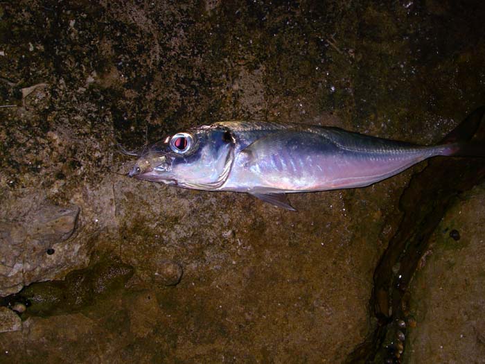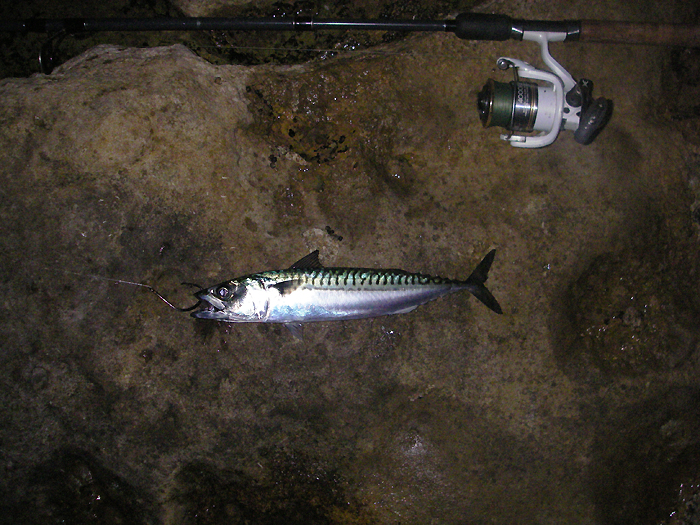 I'd only taken my little Teklon spinning rod and Mitchell reel loaded with 20lb Nanofil the gear I normally use in the rivers. My lure was the silver, Mepps-type, home-made lure with a green, Betalight body that served me well for catching in the dark last year. I took off my bag and put it down before advancing to the edge of the rocky ledge and flicking out the spinner. I'll swear it hadn't touched the water (it surely must have done?) and I was in! The fish wasn't very big so I reeled it in and swung it to hand to find that it was a small scad. Good start. Back it went and out went the lure once more - another fish on! This time it was a mackerel. I grabbed the camera and took a picture then, when I tried to take a second one the "battery dead" sign came on - what a downer. Fish after fish took my lure, often before I'd managed to flick the bale closed.