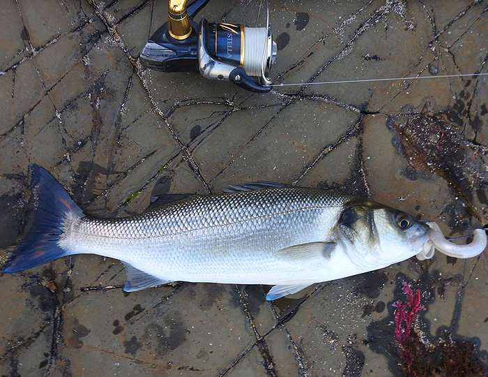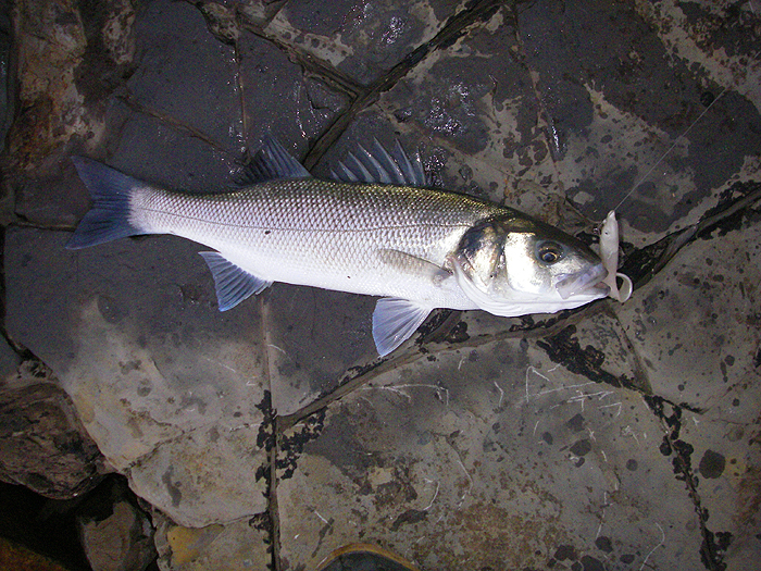 Sure enough the birds weren't pretending and I could see that, close to the edge of the sea, fish were striking and whitebait in a panic were flying out of the water. Out went the Slandra. Bang! Bang! The rod jerked as fish hit the big lure. After the third cast without hooking anything I decided on a change and hurriedly, still with decent bass in mind, switched to an 18cm pearl Evo Redgill. At once I was into a small bass. I took a quick picture and slipped the fish back. The exposed hook of the lure was picking up a bit of weed but on the next cast I had another bass. After that I stopped taking pictures but the bass kept coming. All the fish ranged from about one-and-a-half to three-and-a-half pounds so for a while it was hectic. Despite the change of lures I still missed a fair few bites but the most surprising thing was when I reeled in a mackerel - my first from the place in over fifty years.