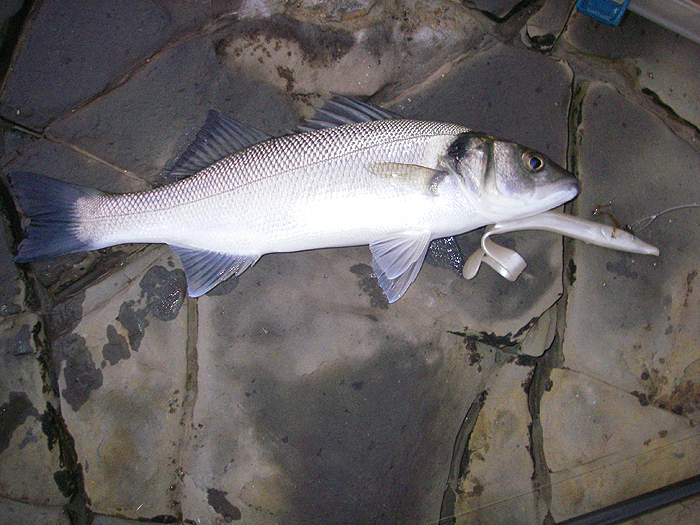 When I got home I let Bill know that I'd had some fish - eight bass and a mackerel in about half-an-hour. The fish went off as dusk fell just after 21:00hr, presumably because of the failing light. The following evening Bill and I went down together. This time he was using his white Slug-Gill lure, not much different to the Evo Redgill but with a weedless hook and a nose-cone weight. The fish were clearly eating silvery sprats about three inches long so I was fishing with a size 4, silver Mepps, with a single hook instead of the standard treble. Bill was into a bass not long after we started - about 19:15 but the fish didn't really get going until the sun went down. The interesting thing was that Bill's plastic eel produced five bass and one mackerel while my spinner landed ten mackerel and only one tiny bass. Phil, who was also there, had fished a different spot and managed twelve mackerel but no bass on a small plug. Even though the bass were all small it looked as though the lures were quite selective.