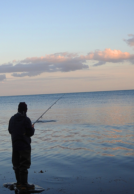 As I walked along the shore towards Bill's "hot-spot" I couldn't resist the odd cast into likely looking places. I had hopes of a decent bass and because there had been so much loose weed in the water recently I was using a big Slandra. I was just retrieving after my fifth speculative chuck when I heard a gull squawk. Looking up I saw that black headed gulls, in a small flock, were frantically hovering over the sea about 100 metres further along. I needed no second bidding and within seconds I'd reeled in and was jogging (as well as I could manage in Chesties) to the site of the action.
