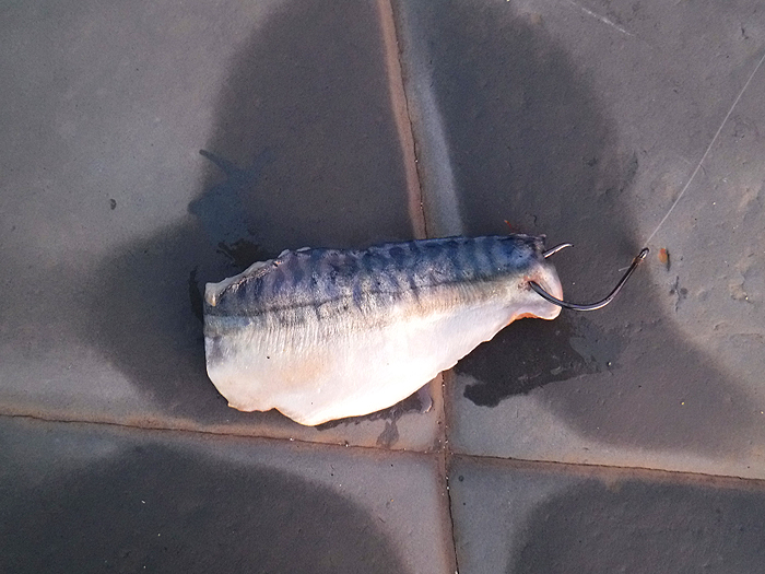The bait - a lightly hooked mackerel fillet from my freezer. I regard this as a sort of hair rig.