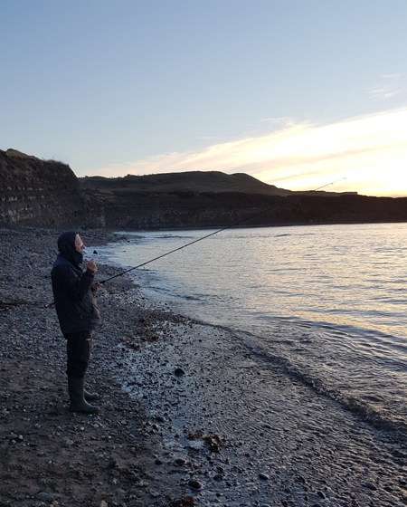 Of course Ben has no waders so we were restricted to somewhere we could fish in wellies. Fortunately the sea had fallen calm and there was little wind so I decided it would be worth trying freelined baits. Time was pressing so long walks were out of the question and we opted to try close to where we parked the car. He'd never used the free-lining tactics before so I showed him how to bait up the 6/0 circle hook with a flank fillet of mackerel and as we stood two rod lengths apart the baits were flicked two or three metres out to sea. Rods were held, bale arms were kept open and the line was gripped gently between the fingers and thumbs of our free hands. As I commented "It's a bit like carp fishing!"