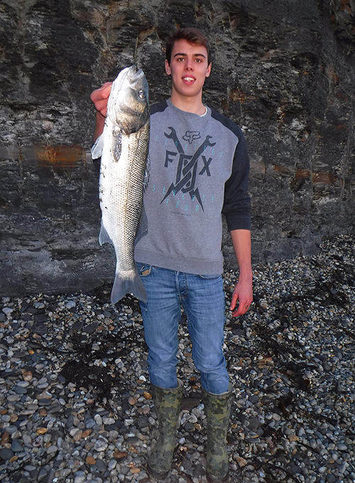 The sun sank slowly towards the western cliffs and as the air chilled the stone throwers, barbecuers and fossil hunters gradually wandered back up to their cars. Now we were alone on the shore with only the gentle slopping of the water to break the silence. Ben said - "I've got a bite!" I moved towards him and I could see the line running out through his fingers at high speed. He followed my instructions to the letter, the braid tightened and then fell slack as the fish dropped the bait. Bugger! He reeled in to find the bait still in mint condition so I told him to lob it out as before. Again we waited. Another five or ten minutes passed and of course we were all keyed up in anticipation of another bite then Ben's line twitched and began to run out again. This time it was going even faster and he waited a little longer before closing the bale. The rod bowed round to his left and the fish was on. At first it didn't pull very hard and he began to lift the rod and turn the handle of the reel but suddenly it was wrenched down as the bass realised it was hooked. There was a huge boil in the water right in the margin. Clearly the fish had run parallel to the shore and stayed really close in, as they sometimes do.