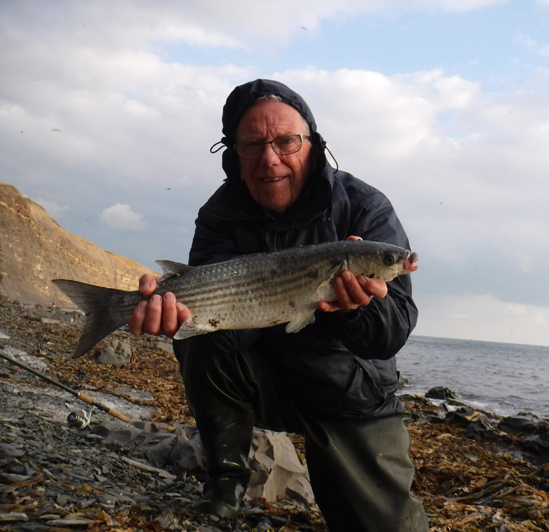 Even with my poor old eyesight I could see that the others weren't catching anything either so I stopped fishing and rooted about in my lure box. In the back of my mind was a memory of several occasions when, at the back end of the season, I'd seen mullet feeding on tiny fry; so I clipped on a little, size 2, silver Mepps. It proved to be an inspired choice. The little lure wouldn't cast too far but it was pretty easy to drop it beyond the surface feeding fish. By keeping the rod up and winding steadily the tiny spinner flickered along just under the surface. I'd only had a few casts when wallop! I was in. Clearly there was a decent fish on the end and I played it carefully for a couple of minutes before I saw that it was a mullet. It was perhaps another five minutes of give and take before I slid my catch ashore onto the weed piles. I removed the hook (all three points were inside the mouth of the fish) before taking a picture and measuring the mullet's length - 62 centimetres so about six-and-a-quarter pounds, possibly a bit more as it was pretty fat.