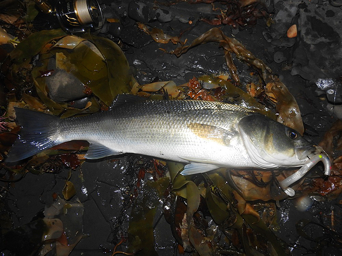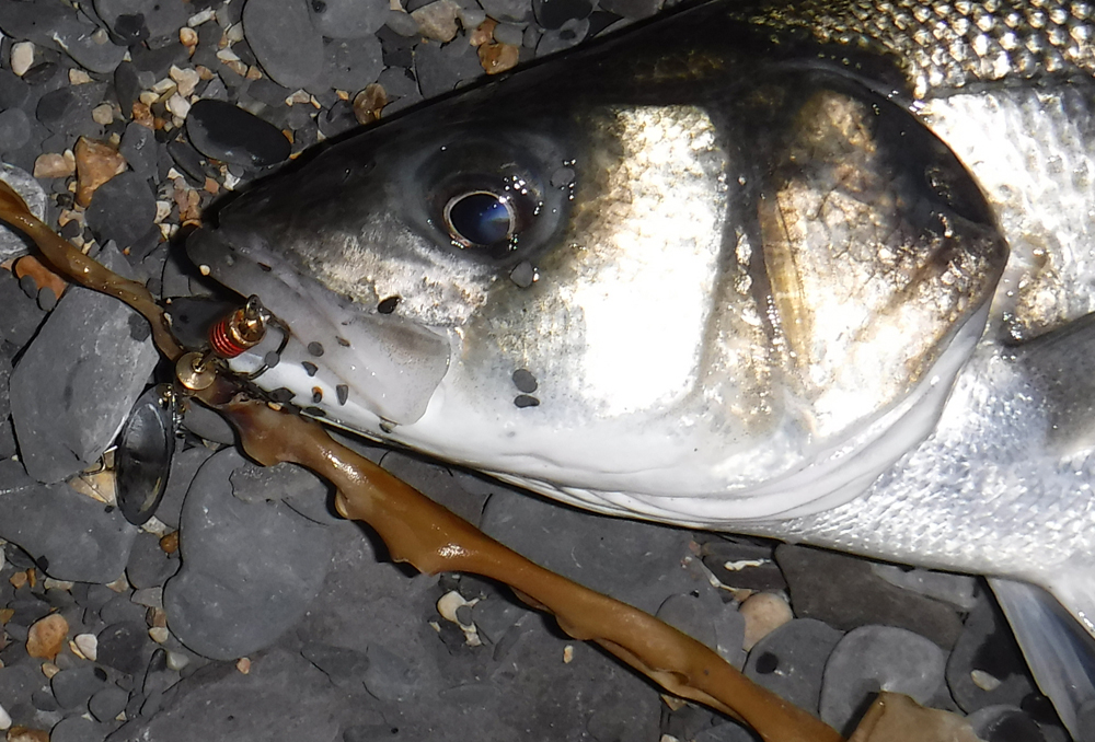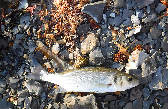 We met in the car park and set off on the yomp to where we hoped there would be some middens of maggoty weed. It was the first decent tide of the series and it's always a bit iffy as to whether the water will rise high enough to wash the maggots into the sea. We didn't need to worry; by the time we arrived at our chosen spot, about an hour before high water, there were already fish showing on the surface. I stopped at the first mound of weed and my pals walked on another hundred metres or so to the next potential hot spot. Nigel was the only one who'd brought a fly rod in hopes of a mullet while Bill and I both chose to spin. I started off with a big soft plastic and Bill was using one of his favourite Slug-gills. Apart from the odd 'nip' neither of our lures seemed to elicit much interest from the fish, even though we could see that there were some bass among the cruising mullet shoals. There were plenty of maggots on the water surface and periodically small groups of sprats or sandsmelts would spray out of the water, disturbed by the bass or mullet beneath them.