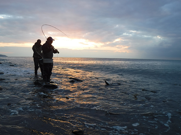 The sun's going down as Nigel's fly rod bends into a mullet.