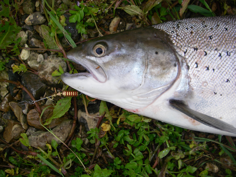 My next significant catch was in May when, fishing with Nigel, I hooked a big salmon on the eight-weight fly rod. The fish took a plastic shad and on the light gear it fought like stink for about forty minutes before my pal was able to help me beach it. All things considered it was an exhausting but very satisfying catch. Nigel had one or two nice trout on flies, including artificial mayflies, in the same month.