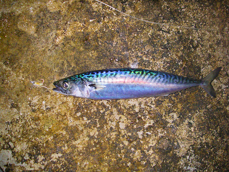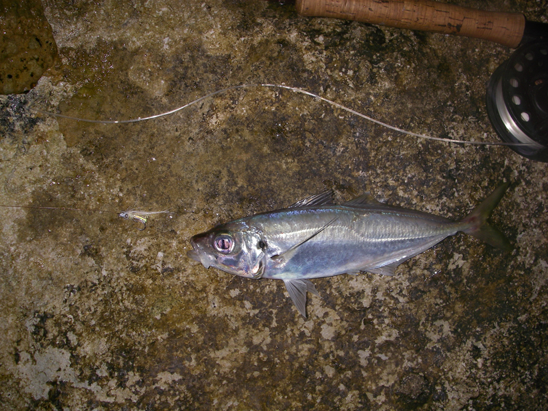 In July fish at last turned up on some of the deeper coastal rock marks. My ‘new’ fly, decorated with a tiny, green Beta-Lite, seemed pretty effective in the dark and I landed lots of mackerel, scad and pollack at various times.
