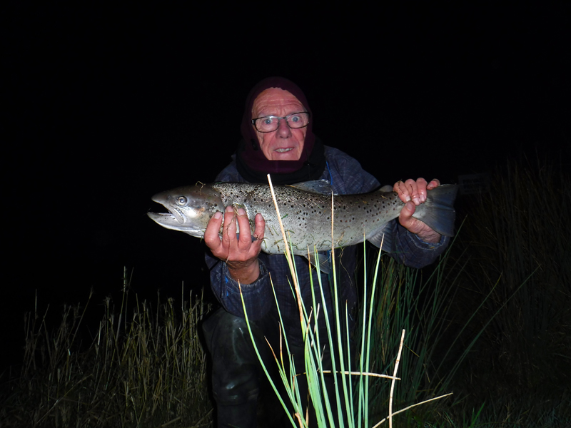 June produced me a fine, six pound seatrout on a Mepps. Also in June I was on a trip to the coast with Bill and after a very slow evening’s fishing, I hooked into a big bass on the fly rod using a tiny, white Delta eel. The conditions were horrendous and as Bill watched I simply let the fish swim round in thick ‘weed soup’ until it tired itself out. I’d never have landed it without Bill’s help in lifting it ashore and it was certainly a memorable experience for both of us.