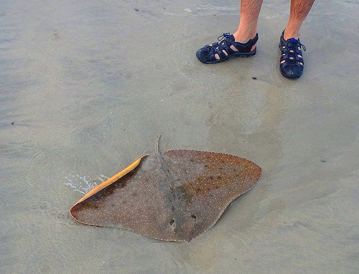 We had a fantastic time on our "holiday of a lifetime" and caught one or two fish whilst we were there. The shore fishing was a little problematic because of the shallow surf beaches and constant dream conditions (for surfers!) which restricted our efforts somewhat. Nonetheless, Paul managed some kind of ray thing on our very first morning on a Rapala from the surf. Paul had said that his Long Cast Rapala was fishing a little too deep and hitting the sandy bottom all the way in but that proved to be exactly what this ray wanted, and it did appear to have taken the lure rather than being foul hooked as I suspected when Paul first shouted that he thought he'd hooked a stingray. The fish was hooked well under the disc ( still foul hooked, obviously) not on the edge of the wing, which I'm guessing meant that the fish had flopped down on the lure rather than being snagged as the lure went by. Don't know what kind of ray it was but it had a very short tail with no obvious sting.