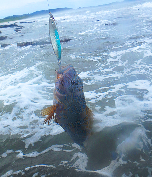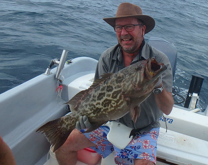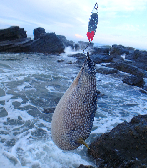 Further along the beach, from the rocks I had a take from a small fish, but missed it on a wedge lure before the sun came up and chances diminished. Two days later I fished the same spot a little earlier and caught eight small grouper type fishes, of a type that Paul had caught in New Guinea, where they are called rock cod. I also had a very unlucky puffer fish which the wedge nicked in the extreme end of its tail. Bites tailed off abruptly as the sun rose. Our final beach fishing trip resulted in a rock cod each for myself and Paul.