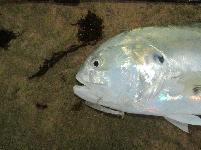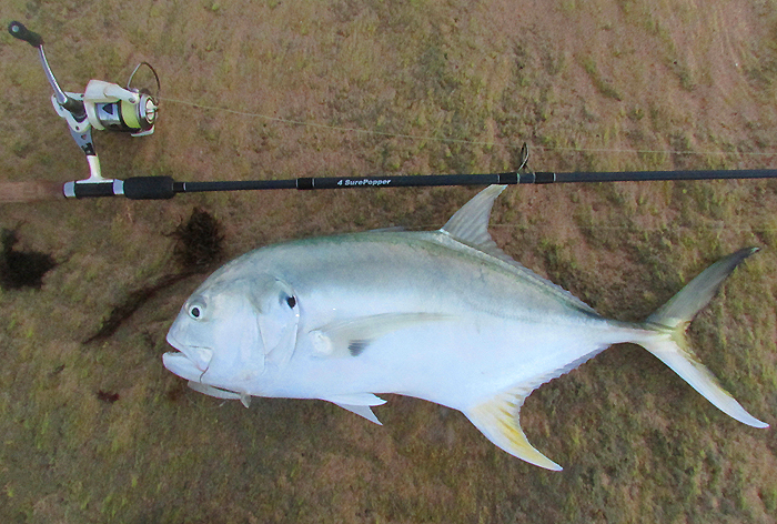 Making my way down to the gap in the reef where a small stream has broken through the rocks, I started to fan out my casts. Almost immediately I had a sharp knock on the minnow, probably a look-down or a small leatherjacket. After that I didn't have a touch for about fifteen minutes. I was just thinking of moving along to fish the other side of the stream when the lure was absolutely monstered about 5m from the rocks. I'm thinking - "big snook!" Then the fish headed for the horizon, line streaming from a tight drag - 50m, 70m, 100m, finally slowing down and stopping when it was about 150m away. Rod held high in the air, I waded out to furthest protruding rock in a vain attempt to gain a bit more control. It then became a war of attrition, gaining line slowly only to lose it again as the fish made another surge. After 20 minutes I finally got a glimpse of the unmistakable broad head and scimitar tail of good Jack Crevalle (I had already realised it couldn't be a snook when it took so much line on the first run).