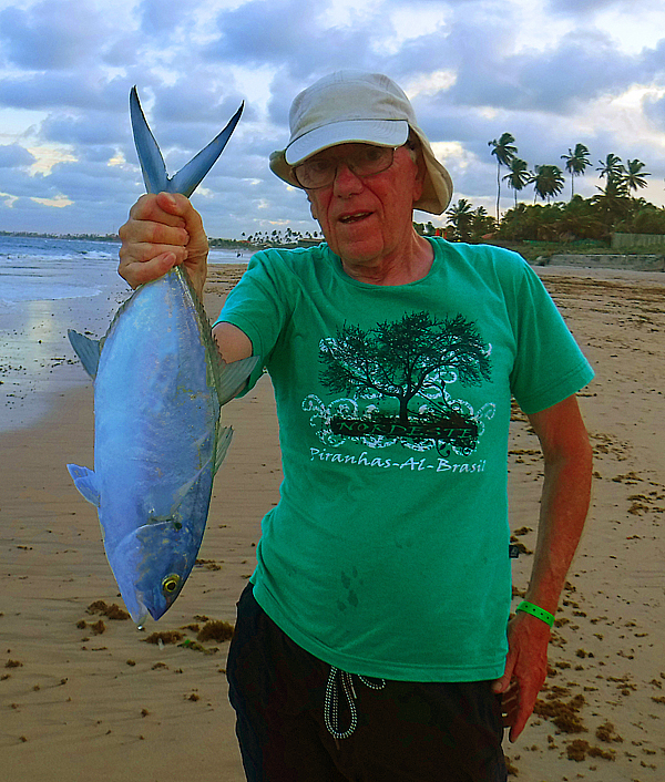 Later that day I walked along to try the likely hot-spot at high water but it seemed quite dead and I didn't have a bite. That evening, for a change, Richard and I tried bait fishing in the dark but again it was futile and the original baits were still on our hooks when we packed in and went for supper. It seemed that lure fishing the low water at first light was our best bet. This time we armed ourselves with plugs. Mine was a large green and silver fakebait and Richards was a little slow sinking minnow with the mid-body treble removed. This one was given to me years ago by my New Zealand pal Alan Bulmer. We hurried along to the reef just as the first light was appearing on the horizon. Straight away we saw some sardines breaking the surface so we were rarin' to go. We picked our spots and out went the lures. I missed a bite on my first cast then, after about ten minutes, right out of the blue, my rod buckled over and a strong fish made a fast run out to sea. There were a couple of small boats moored sixty or seventy metres from where we stood so as the fish took more and more line I became concerned about the presence of anchor ropes. I shouted for Richard and on the third shout he heard me and came hurrying along. At this point I'd managed, at last, to slow the fish down and by walking along the shore I succeeded in applying a bit of side-strain and turned it away from the obstructions. Now it was fairly easy and within another five minutes I had it on the beach - a fine blue runner - the first one either of us had ever seen and although they are smaller than some other jack species it had all the fighting qualities of the family. As we were unhooking my catch and taking its picture a group pf youthful Brazilian revellers came along, presumably after a long night out, and they asked us to let one of the girls have her picture taken with the fish before we returned it to the water.