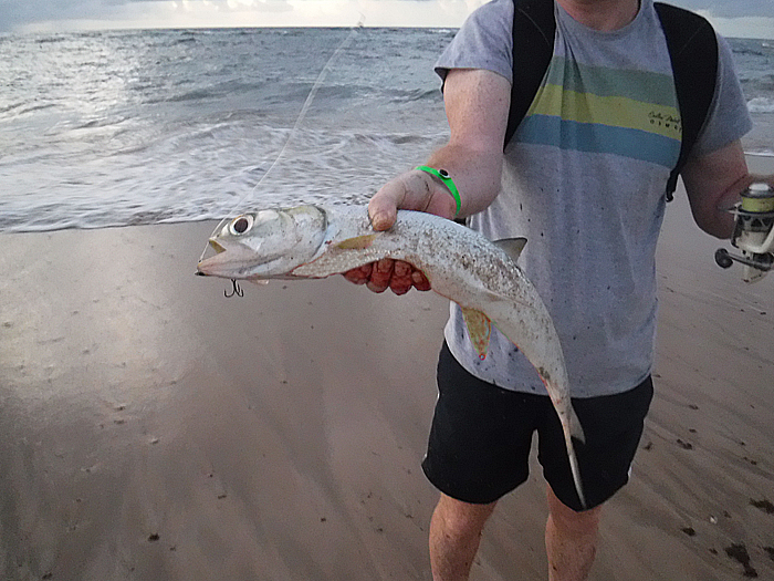 Of course we were chuffed with our catch but there was still time for a few more casts so we continued spinning. Not long afterwards I missed another decent bite and fifteen minutes later just as I was thinking about packing up, I saw Richard walking towards me with his rod in one hand and a long silver shape in the other. It turned out to be a huge ladyfish. Now we've both caught ladyfish before and they are super, running, leaping fighters, so I said "Did it give you much of a tussle?" However, it turned out that the fish had struck right at the water's edge and immediately surrendered by leaping ashore. Like me Rich had also missed a couple of bites. That was almost our last chance to fish - so not a bad way to finish.