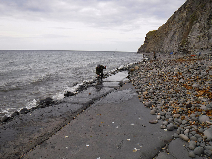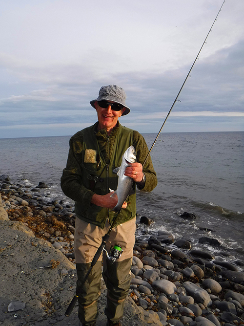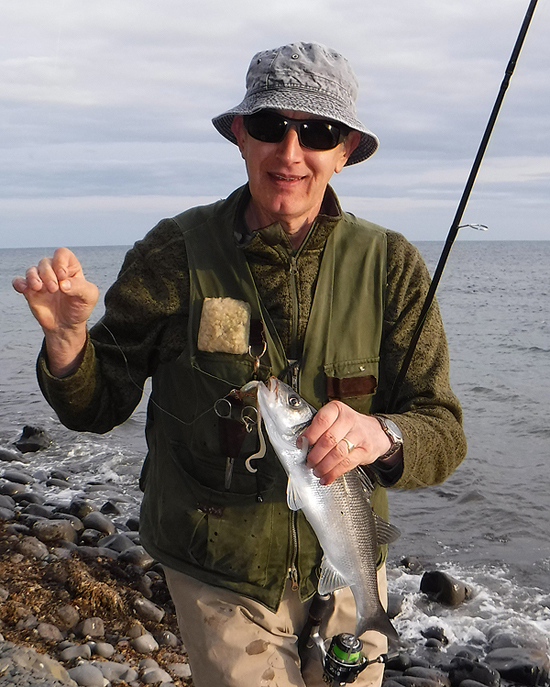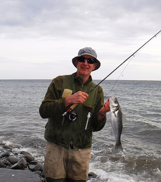 As it turned out what remained of the weed was concentrated along a couple of metres of beach and the maggots had mostly turned to pupae. I stood about hopefully as the tide peaked waiting for the fish to turn up. I threw quite a few armfuls of stinking, rotting seaweed into the sea but it was futile. Sure enough I saw the odd smallish mullet but there was never a big enough concentration of fish to give me much chance of a catch. So I blanked (nothing new there). Ever hopeful and knowing that things can change dramatically in the course of half-a-day I went again on the evening tide with my pals Bill, Nigel and Dave. Just to be different I decided to try float fished maggots or bread while the others stuck to either fly fishing with maggot flies and Delta's or spinning with soft plastic eels. It was much rougher and windier than it had been in the morning but there were a few more fish about, both bass and mullet. However, my light float gear was a bit of a disaster - skating across the surface in the stiff breeze. My pals all struggled a bit as well. Nigel and I blanked, Bill had a couple of missed pulls on his Slug-Gill lure and only Dave had any real success. Firstly, using his fly gear, he landed a bass on a maggot fly - he says it took him completely by surprise, just as he was lifting off for a back cast. Then, a bit later he had a slightly smaller fish, this time spinning a long, wriggly tailed 'Baysand worm'. The fish did not hang about so we packed in not long after high water.