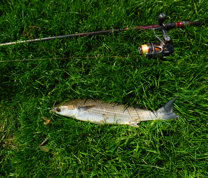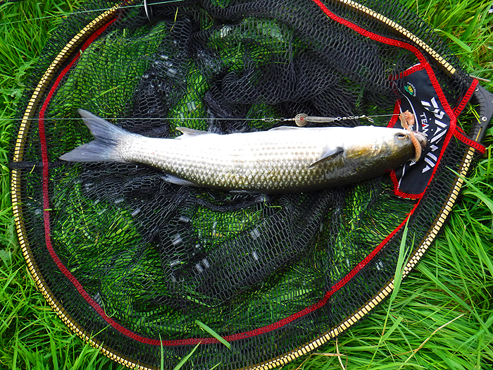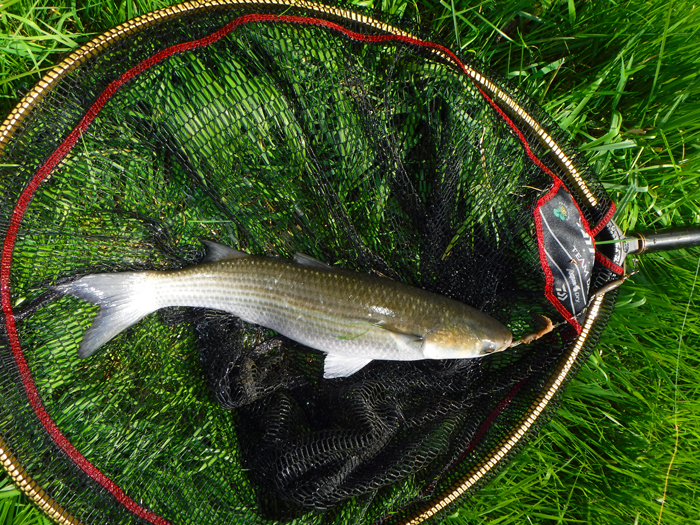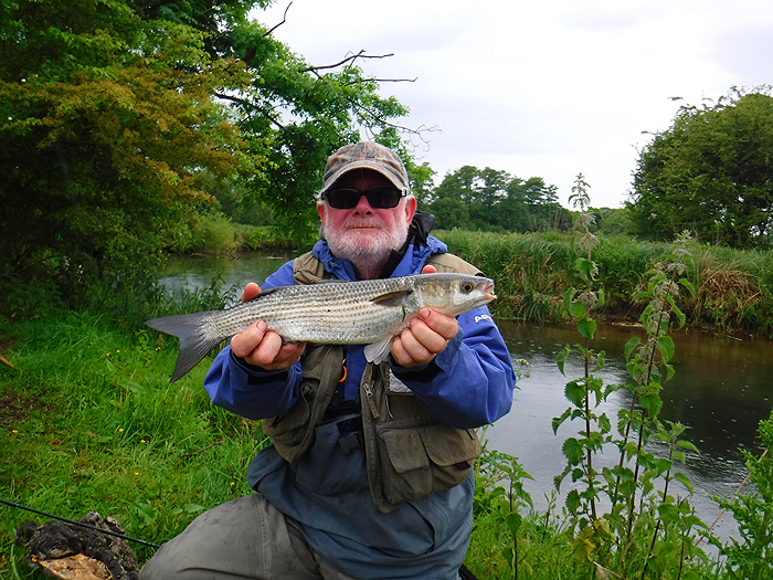 Having seen a follower I pressed on downstream and it wasn't long before I managed to induce a small group of fish to follow. If it is possible to get several mullet competing for the lure you stand a good chance of catching one and so it proved. It wasn't long before I was playing a fast moving, hard fighting specimen to the net. The trickiest part of the operation is holding the net handle between my knees while I manipulate the mullet into the meshes from the high bank. Over about four hours fishing during the week, some of it with my pal Nigel, we landed ten thinlips. Not bad for a handful of ragworm, bright conditions and low river flows. At least it's more consistent than many other forms of angling.