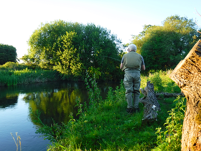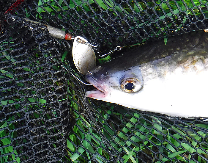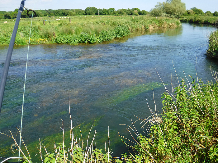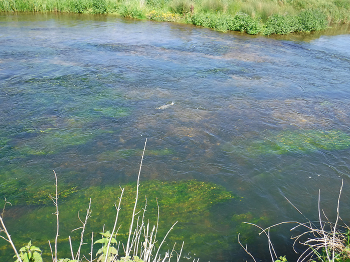 I hadn't been fishing long before I saw a grey shape following the spinner and I was encouraged. However, this year there is an exceptional amount of weed growth. All this streamer weed in the shallows makes spinning for mullet rather tricky. If you cast up and spin quickly the mullet will frequently chase the lure but I prefer to cast across to the far bank and then allow the spinner to swing across before I retrieve. As I say, with lots of weed trailing down it can be difficult to fish in my preferred way. However, by keeping the rod up it is often possible to avoid snagging and this has the advantage of tempting the odd fish from between the weed clumps..