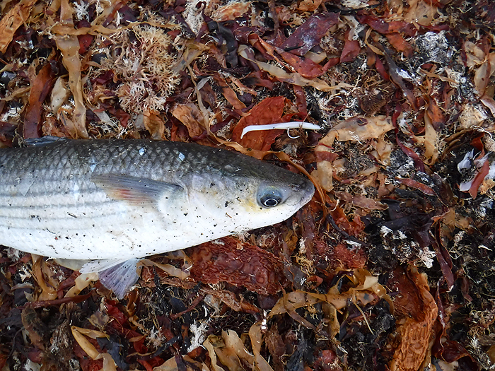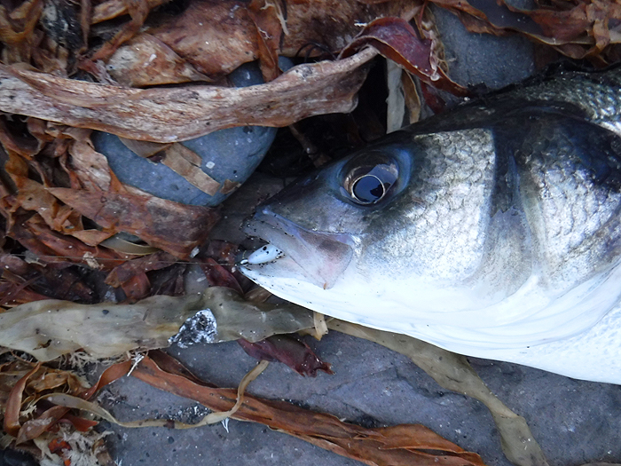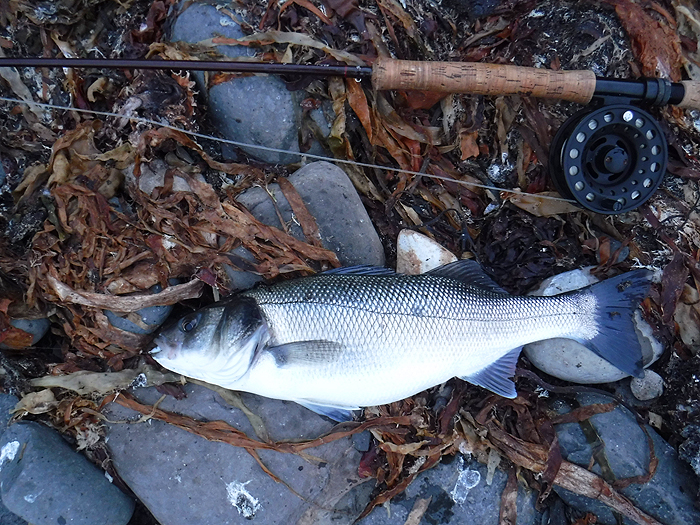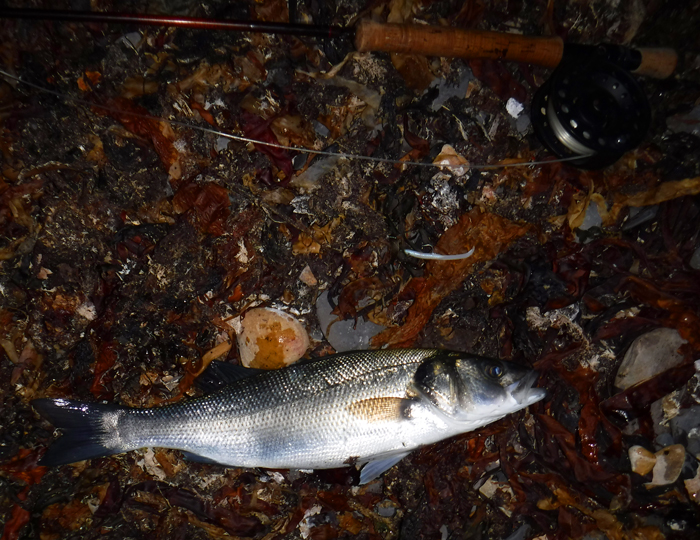 This morning was the first decent tide of the present series. My pal Bill had told me that there was weed on the beach, so I set the alarm for 02:45, gritted my teeth and went to bed. It was dark when I arrived on the shore and at that time of day it's not too warm so, picking my way over the rocks in the light of my headlamp, I trudged along for a mile or so until I reached a big weed midden. It was still pretty dark so I started with the spinning rod. For fifteen minutes I cast and retrieved with a whitish EvoStix lure. At first there was nothing at all then as the light began to increase I felt a couple of gentle nudges. "Schoolies" I thought and I changed to an Evo Redgill in the hope that the exposed hook would pick up a fish. Just more useless taps - all extremely close in and then I noticed one or two small swirls only inches out from where I stood. I walked back to the bag and picked up the fly rod. The cast was armed with a white Delta plastic eel (perhaps more appropriate for the apparent size of fish present) so I began to cast and retrieve. There was no need for distance as I could now see that the feeding bass were mostly at very close range. The slight cross wind made it a little more difficult than I would prefer but again I had a couple of gentle plucks on the lure. After a few minutes I had a firm pull and hooked a fish which wriggled a few times before coming unstuck.