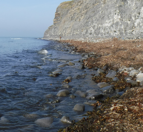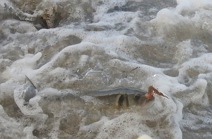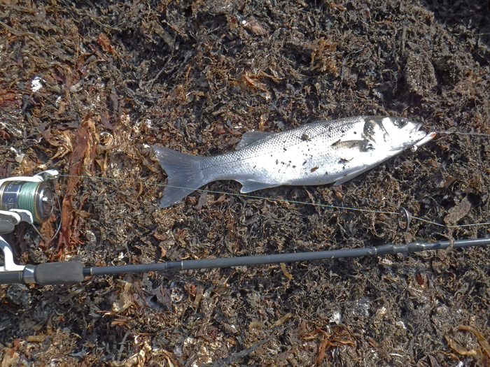 My tide table indicated that it was the first spring tide big enough to reach the old rotting weed middens. The wind was about force three from the north east so there was only a slight swell and there were tonnes of maggoty weed piled towards the high water mark. When I started to fish the sea was calm with fish right in the edge – bass at first then more mullet later on the tide.