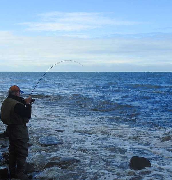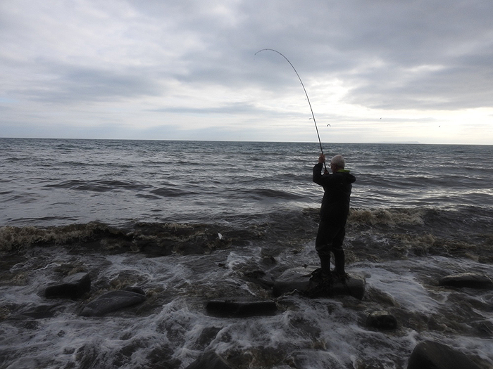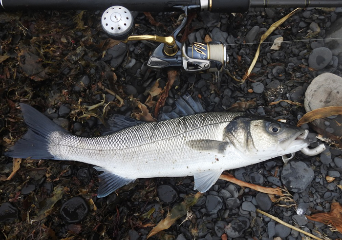 He bashed on and managed another bass first cast on the small 70mm minnow but again it lost its tail. Finally he had one more with the big minnow and a couple on the Redgill as the fish thinned out. Then he hooked and dropped two more in the edge before he packed in, it was pretty rough and he was soaked but not surprisingly chuffed with his catch.