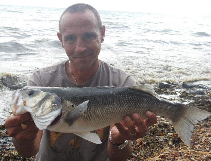 The following day another pal, Rob, went on his own to fish the evening tide. Again he said the sea was rough with a biggish swell and a strong WSW wind. He tried a variety of lures and altogether he landed ten bass up to 3lb and a big mullet of 5 to 6lb? The tide was still a little off the weed on arrival but he had a bass of 2lb within 15 minutes on a big black minnow then he missed a couple more bites so tried an Xrap and hooked another of a 1lb. Now, as the tide came up to the full, the mullet and bass really started to show on the surface. There was too much swell and weed to fly fish with the streamer fly so he switched to the 90mm black minnow and had 4 bass in almost successive casts missing several more bites. The next bass took the tail off the 90mm minnow and switching to the bigger minnow only produced missed bites. Mullet were going mad at this point so despite the conditions he had a crack with the maggot fly and after a few missed bites managed to hook a fish, He thought it was just a small one as it came in very easily but on seeing it in the surface he realised it was a bit of a beast. After a little tug of war in the edge he managed to land it. He says “Typically the batteries in my scales were flat so I couldn't weight it but it was easily up there with the biggest I've caught.” Not surprisingly he persisted with the fly after that and had a couple more missed bites until eventually he lost the fly to a good fish.