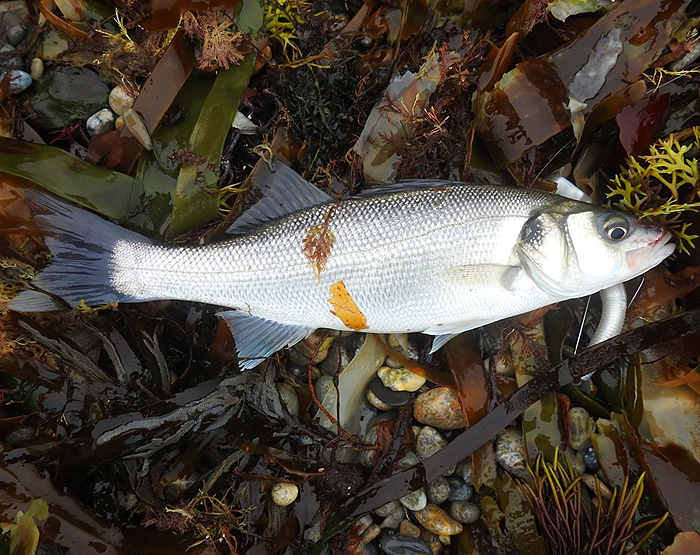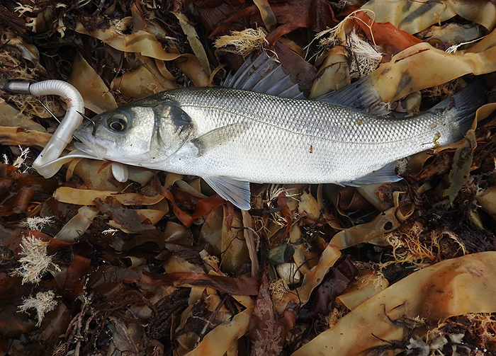 To return to the bass fishing. Bill spun with a weedless EvoStix lure weighted with a drilled lead head. These lures are very consistent bass catchers, they are easy to use in all sorts of conditions and they are relatively cheap, tough and durable - so excellent all round. Another of my pals Phil Vivian also went spinning in Purbeck on the same day as Bill and he caught only one bass but it was about four pounds. In this case he was using a Black Minnow and he says that the fishing conditions looked poor. He also made another comment about using the Black Minnows that they are very attractive to wrasse, which is fine if you are rich and want to catch wrasse because for sure those pearly teeth will rip the lure to bits in no time. So perhaps it is wise to restrict your B.M. bassing activity to places where 'brown fish' are thin on the ground? To complete the picture another pal, Nigel Bevis, also caught a few bass on lures fishing along towards Weymouth but I don't have any pictures. Clearly I missed out altogether - pity!