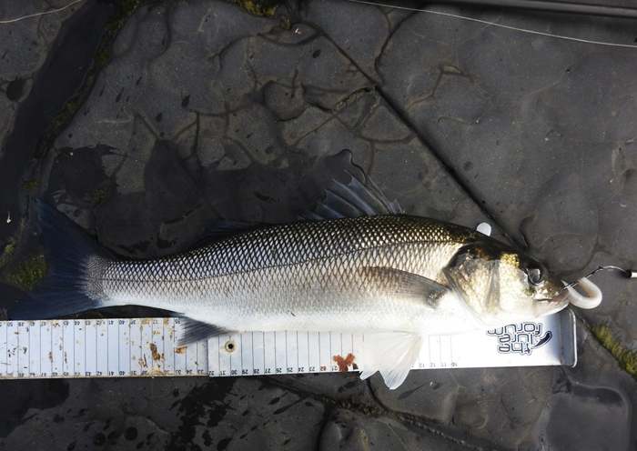 Bill Fagg emailed me later that day to say he'd also been fishing on another stretch of the coast. Interestingly as he walked along, round about low water, he'd seen fish tailing really close to the edge over some wrack covered rocks. Now last year Bill and I had seen the same thing happening at the same spot and I'd hooked and lost one of the bass on a soft plastic. This time Bill went one better and he caught a reasonable fish which took only inches from the water's edge. Fantastic stuff! On the same session he caught a couple more bass on his Evo-Stix/Slug-Gill type lures. This approach to lure fishing seems very consistent and by varying the size of the cone lead it is possible to fish almost anywhere without losing any gear.