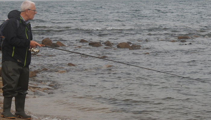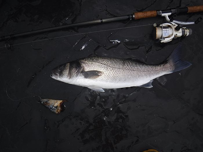 We fished on and not long afterwards Bill who was now just to my left had another bite and this time he hooked it. It was a reasonable bass, nicely hooked and after a short battle it measured 56cm - excellent stuff! The tide was pushing in fast and although we flogged away there were no more signs of active fish as the water deepened. Neither of us was keen to get a soaking on the return walk so we packed in and made our way back to the car park and breakfast.