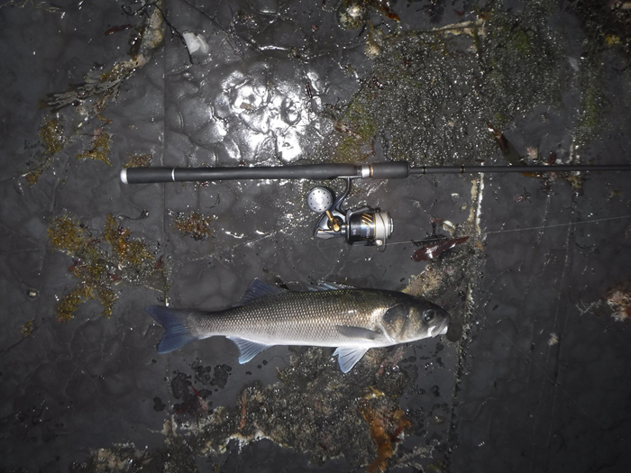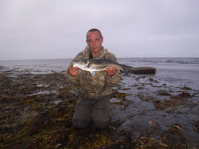 My pal Bill has had a week's holiday and needless to say he went fishing a few times. After catching a fish the other morning he rang me to ask if I fancied joining him for an hour or two the next day so of course I said yes. He picked me up just after five a.m. and we drove to the coast. When we arrived it was still pretty dark because there was heavy cloud cover so we needed the headlamps to walk along the shore to our chosen spot. The tide was still well out and sure enough, as we approached an area of flat rocks we saw signs of fish. Now it may be hard to believe but the water was only inches deep, a foot at the most, over the flat ledge but apart from the occasional flap of a tail or swirl the bass (which were a decent size) managed to remain invisible. It just shows how easy it would be to scare good fish away by wading even ankle deep. We stood well back from the water's edge and watched until we managed to locate the position of a fish (or possibly two or three?). Bill suggested that I should have a cast with my big Slug-Go but I wanted to see how he approached the fishing so I persuaded him to have a go with the weighted, white Evo Stix lure. He flicked the weedless lure a few metres beyond where we'd seen the fish and began to retrieve and as the soft plastic reached the critical spot (about two metres from the edge) there was a sploosh and his rod jerked round but the fish wasn't hooked and it shot away followed by a few choice words.