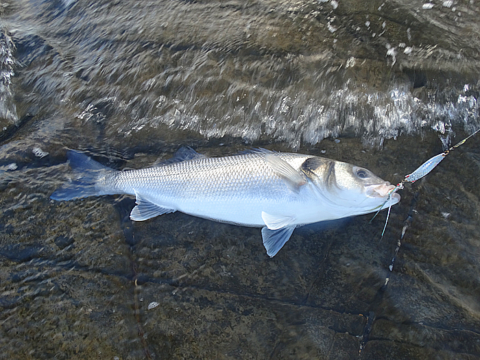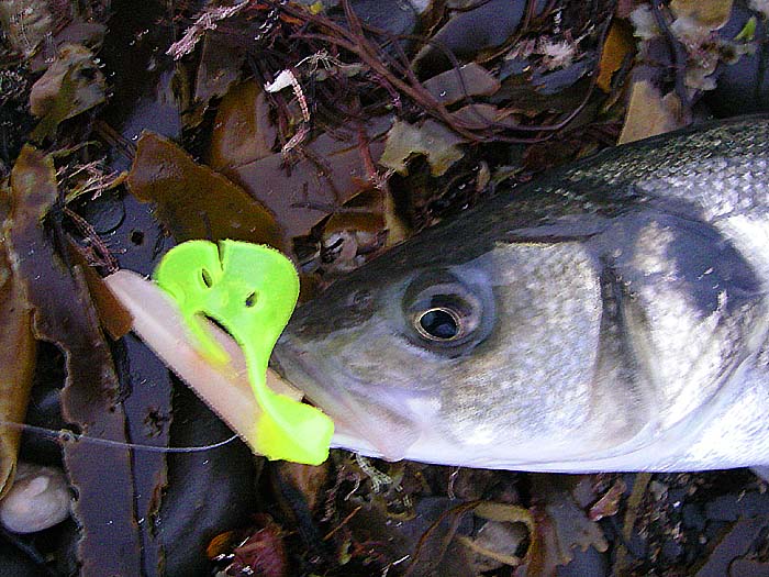 Spinning with lures is far from being the only way to catch bass and of course many other species are liable to be caught even when bass are the target. One of the major early improvements in our sea angling tactics was the use of ‘dry flies’ to tempt surface feeding mullet. In my forty-odd years experience there is little doubt that floating poly-maggots, with the added attraction of a few live maggots, are the best way to catch maggot-skimming-thicklips. Bass will also gorge themselves on Coelopa maggots and at times can be a nuisance to the mullet angler. However, it is possible to selectively catch bass on the fly gear by using fry imitations and streamer flies. Trial and error has shown that small plastic eels with waggy tails are as good as or better than most traditional flies and have caught, not only large numbers of bass but also pollack, mackerel, scad and garfish. Even the occasional mullet falls to these ‘flies’ although it is always doubtful whether they actually took them or were accidentally mouth hooked.