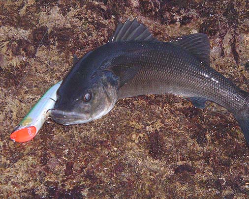 We started off using traditional Toby spoons and similar lures and to be honest, although they catch fish, the places where it’s possible to use them are seriously restricted by tackle losses on snags. The introduction of buoyant plugs which fished close to the surface was a major improvement; “bassy ground” kelp, wrack, rocks and shallow water could be fished with reasonable confidence and once you got to know the places you were fishing lure losses dropped, on average, to one or two per season. A lot cheaper than bait for a season’s fishing. The best of the buoyant plugs are still very effective bass catchers and in recent years they have been joined by many “Japanese” models which incorporate moving weights to improve casting distance. To be honest distance was never really a problem for bass and with the introduction of gossamer fine braided lines it is hardly worth considering these days. The innovation of surface popping and sliding lures (a USA innovation) practically solved the snagging problem completely, although there are times when the bass seem more interested in sub-surface feeding than smashing into a popper.