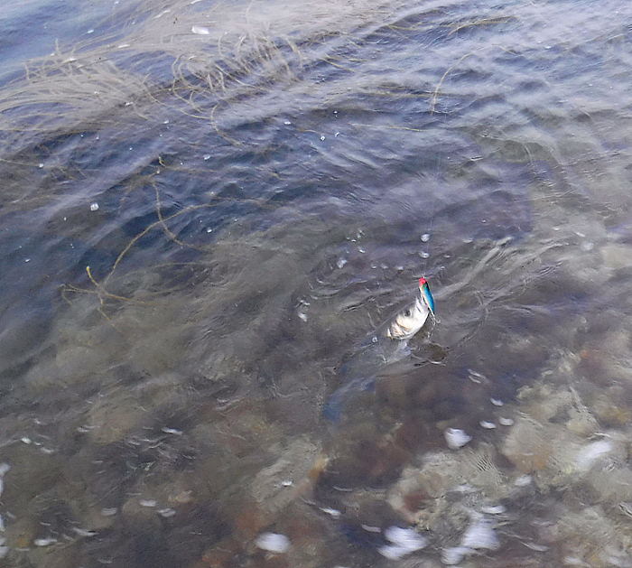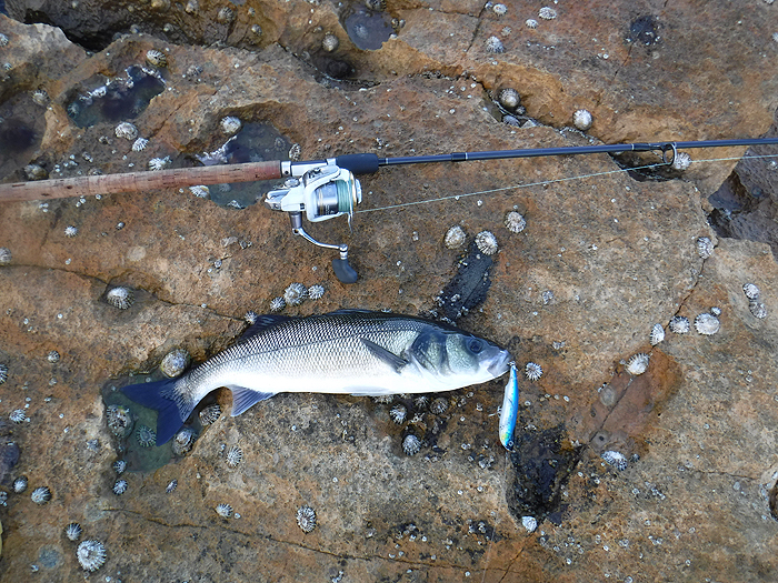 As I mentioned in the last Freshwater BLOG page I've also been sea fishing. I checked my tide table last night and saw that it might be possible to fish an early morning session on a local tide race without drowning myself. I was up and running at 04:00hr and down on the coast ready to fish by about 04:45. It was a beautiful morning the sea was pretty calm and gin clear, there was a bit of cloud cover but it was pretty warm and bright and there was a light offshore wind. I spent a few minutes before I plucked up the courage to wade through the strong ebb flow to my chosen mark and then took the plunge. It wasn't as bad as it looked and a few minutes later I was ready to make my first cast. To avoid snagging on the thongweed and kelp I'd clipped on a blue and silver Yo Zuri slider. I flicked the lure out ten metres or so into the race as a trial and as it hit the water there was a splash and crash and I was in. The bass was no monster but it fought pretty hard in the strong current. I grabbed the camera from my bag and took a few pictures as I played and landed the bass - less than two pounds but beautiful and very welcome all the same.