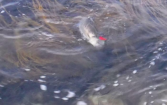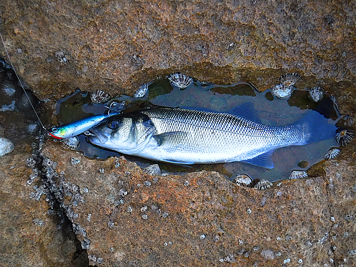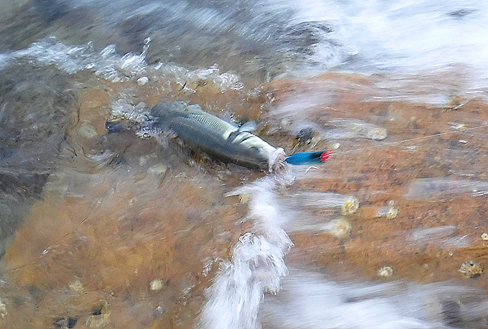 For the next hour and a quarter it was hectic. Every few casts I was hit by another fish and although there were no big ones a three pound plus bass in a five knot current is a handful on light spinning gear. My lure has strong, sharp hooks so after the first couple of fish I popped the pliers in one jacket pocket and the camera in the other to try and speed things up. I wasted quite a lot of time searching the race for fish but all fifteen that I caught were in the crest as it broke over the ledge I was standing on and most of them were within ten metres of where I stood. The bigger fish ripped line off the reel until I could steer them into slacker water. Fantastic stuff! Although the lure was very effective I missed a few bites and it was noticable that the ones that failed to hook up were often smaller bass and several of them cartwheeled out of the water as they tried to grab the surface lure. By 06:15 the race strengthened quite a lot and the fish seemed to stop biting (I assume they had moved elsewhere so (a) I should have been fishing earlier (subject to the risk of drowning) and (b) I would have packed in by 06:30 but it was still too dangerous for an old wrinkly to wade back to terra firma so I hung about for some time.
