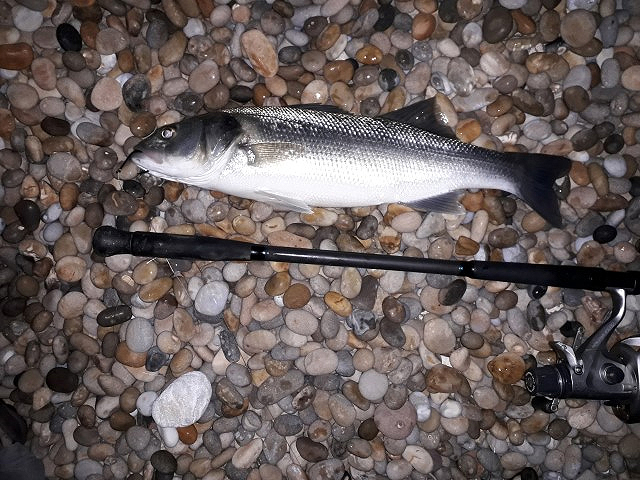 "I also caught a few scad. Once I'd stopped feathering and before it died a 9 inch scad went on an 8/0 circle hook and was lobbed out on a simple 1oz ledger, the weight was needed to avoid the line being trapped in shingle but I was casting less than ten metres. The scad soon revived and was gently “nodding” the bass rod. After 30 mins or so the “the nod” turned to into a “whack” and line was being stripped from the bait runner, a spirited surface tussle ensued and a bass of between 4 and 5 lb was on the beach (no scales). I couldn't resist trying another live scad but it managed to escape (?) from the circle hook. I put a bigger dead scad on and started to tidy up the gear, I was thinking “I'll just check to see if the bait is OK!” and picked up the rod and started to wind. To my surprise there was another decent fish attached. This one turned out to almost a carbon copy of the first, but it looks skinnier so I'm sure that it's a different one."