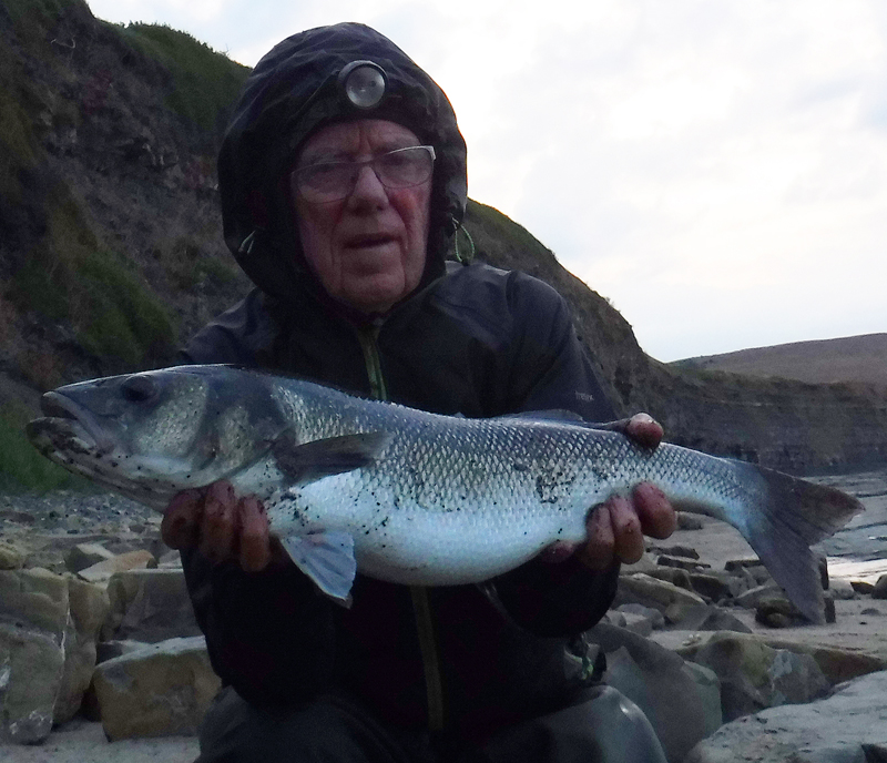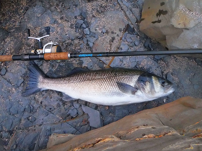 Thirty minutes or so passed without incident and although sunrise was still some time away it was now beginning to get quite light. "Was that a pluck?" I wasn't sure even though the braid transmits every tiny movement (I can sometimes feel seaweed flies bumping into the line). Anyway it certainly wasn't a bass run. Five minutes later there was a definite twitch and a few inches of line were taken by 'something'. Again no run developed but about ten metres to my left I noticed a swirl. At first I wasn't sure whether it was a submerged rock but then there was another swirl and a third one followed by a big silver flash. Clearly two or three bass were feeding in about half-a-metre of water close to the margin. I waited for another ten minutes but there was no bite and the swirls didn't come any closer so, assuming that the bait might have settled in an unsuitable spot, I reeled in and cast again towards where I'd seen the fish but a little further out so as not to disturb them. I drew the bait back a short distance, opened the bale arm and again I waited. Twitch, tug, tug, I let the line slip through my thumb and forefinger. Now it was going steadily and beginning to accelerate until the coils were streaming off at speed. I dropped the rod tip towards the running fish so as not to give a jerk on the line while I gently closed the bale arm. The line drew tight and as the rod began to curve round there was a mighty splash away to my right and the clutch buzzed sharply. At last I was in!