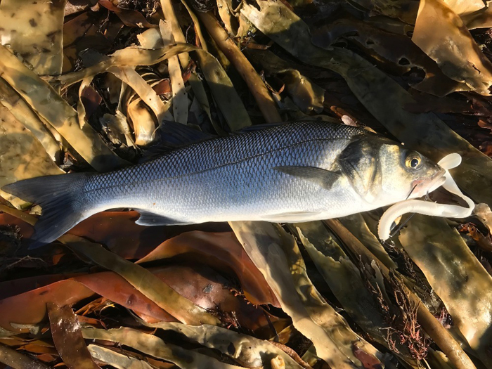 After catching a couple of bass myself earlier in the month and then having the bait-fishing trip with my pal Richard, when he caught a nice one of well over seven pounds I wasn't able to go for a few days and we had a bit of a blow. Things calmed down again and I felt the urge to try once more. Following the stir up the sea was calm and clear but much of the local shoreline was several feet deep in loose wrack and kelp. Of course when the tide comes in most of the gullies are full of drifting weed but the bass don't seem to mind and will swim about over the weed searching for something to eat. The weedy conditions never stop me fishing because my freelined baits will usually lie on top of the leathery brown fronds, but it wastes time (critical on my short sessions) and causes a couple of little problems. Firstly the large, exposed hook quite often lodges in the stem or holdfast of a lump of kelp so the bait is not freely available to a fish and secondly, if I get a run weed may catch on the line causing drag which makes the bass drop the bait or enables it to pull it off the hook.