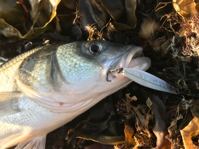 On my next trip two days later I went at first light and this time tried a weedy gully (just for a change). I fished for about an hour, again with sardine bait, and had one good run which I missed. Three abortive runs out of the last four was pretty bad so I wasn't too happy. As it happened later that day my pal Bill reported that he'd just had a really good session catching twelve bass spinning with Slug-gills and Savage Gear Seeker lures (The latter is surprising as he rarely uses metal lures). Most of his fish were three pounds or less but pretty exciting fishing.